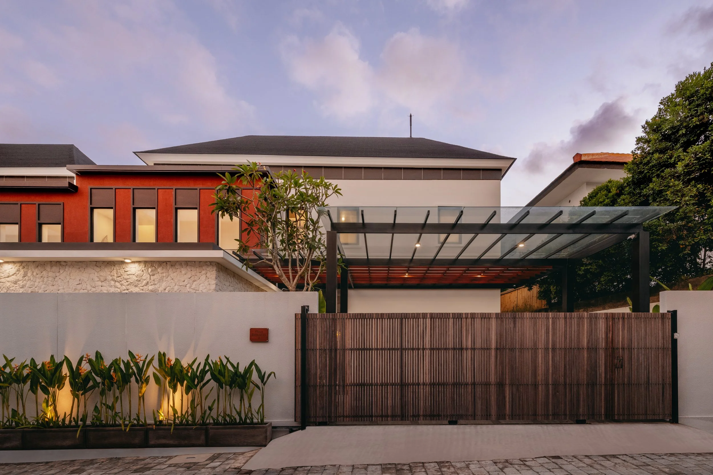 Located at Tibubeneng, Bali, Rumakiki is situated near two extremely popular tourist area Canggu, and Seminyak. This condition presents an opportunity to create an escape, a place of stark contrast from the ever busy tourist locations. The villa is situated at a peaceful, well-lit alley, entered from a larger and busier main street. Vibrant natural colors are chosen to create a bright and welcoming atmosphere. Red terracotta color reminiscence of clay and brick create a focal point while complimenting the green vegetation in the surrounding, while natural stone and wood cements Bali's culture into the facade.